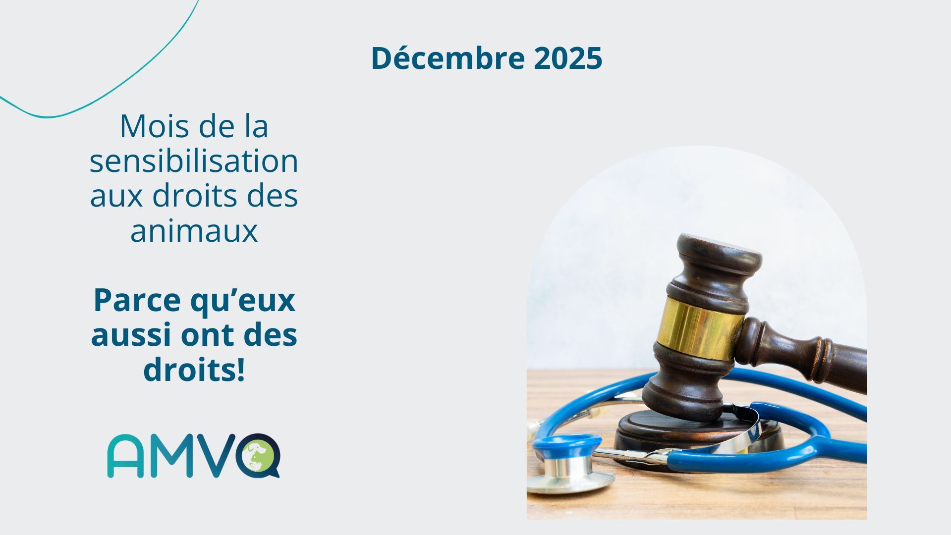 Le droit des animaux, c'est l'affaire de tous! Que nous soyons propriétaires d'animaux, éleveurs, responsables de refuges, travailleurs en établissement de recherche ou œuvrant dans le milieu vétérinaire, les lois et règlements encadrant les droits des animaux nous concernent.